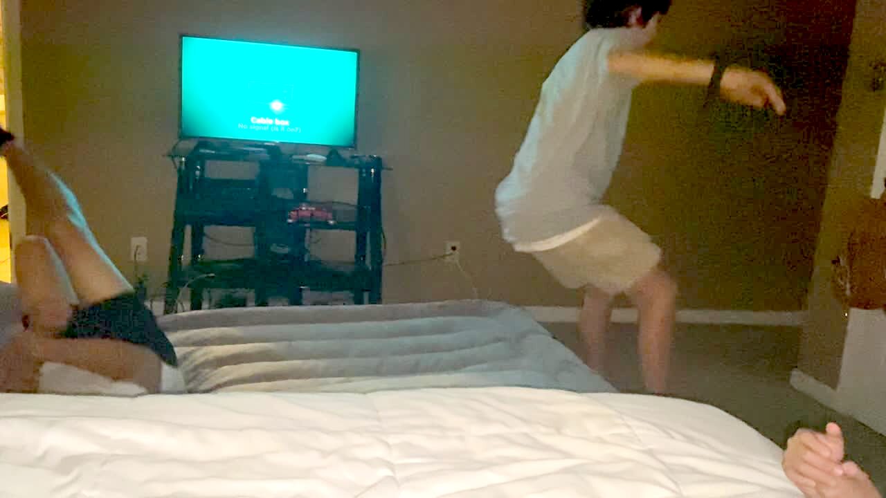A teen boy does handstand push ups off of a dresser then breaks the fan light when he sets his feet down.
