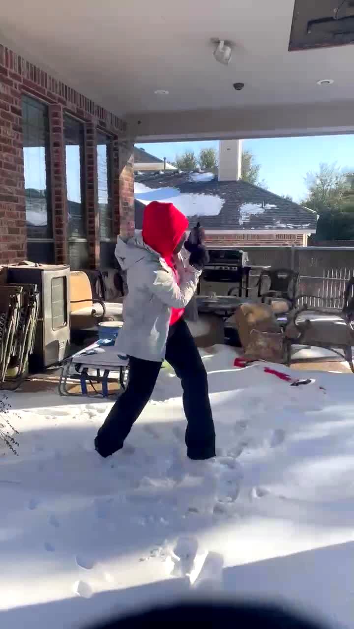A young girl hits a snowball with a baseball bat, but she loses her grip on the bat and it flies into a light on the house.
