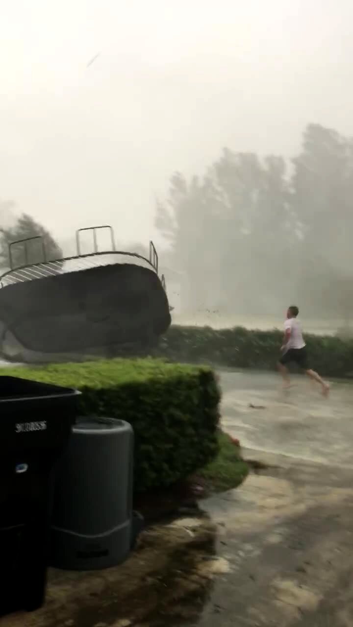 A trampoline rolls down a street in a rainstorm as two men chase it.
