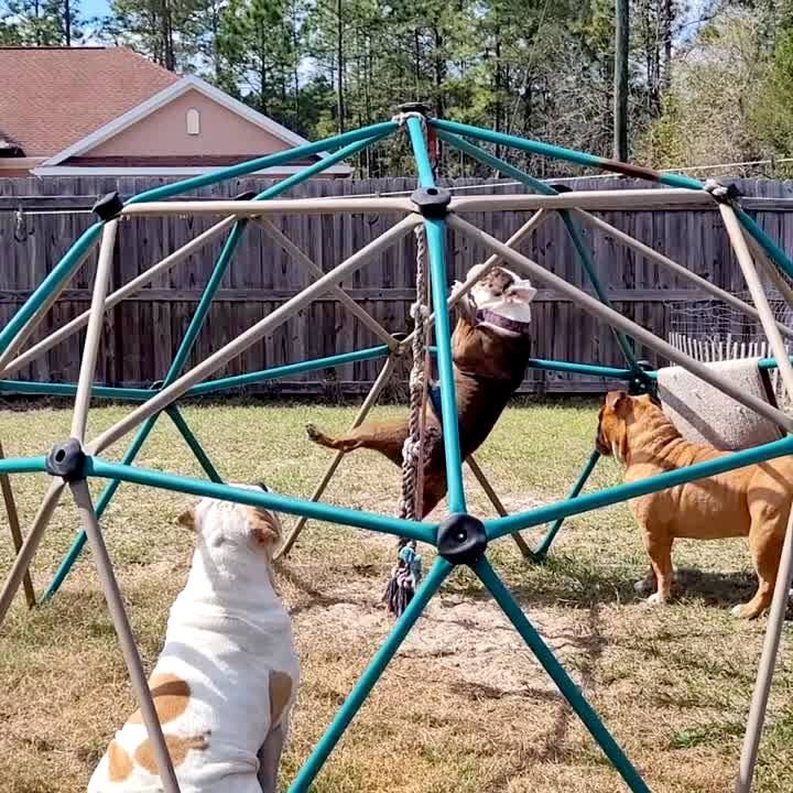 A dog jumps onto a jungle gym outside but loses his balance and falls in.