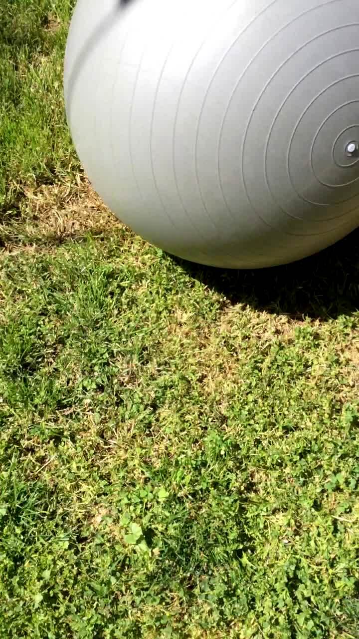 A woman lays on a yoga ball and does crunches and a dog runs up and knocks her over and takes the ball and she falls in the bedroom.