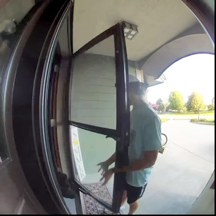 A teen boy rings the doorbell on the front porch. A dog opens the door and the screen door smacks the boy in the face as the dog runs out. Security Footage.