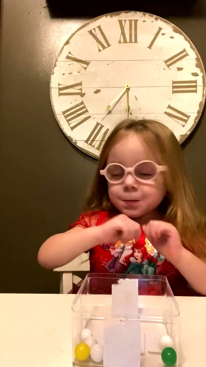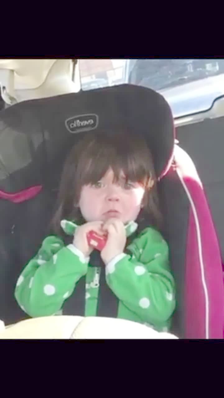A woman with the camera in a car catches a tot girl as she eats candy from a raisins box. The woman asks her if she put her candy in a raisins box to trick her and the tot girl nods.