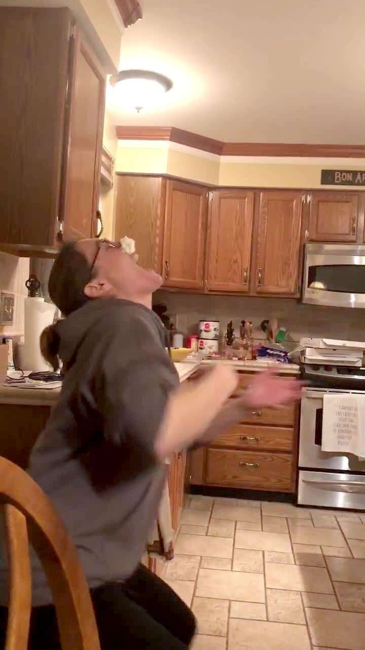 A woman in a kitchen does the whipped cream challenge and flings whipped cream up in the air off her arm and it lands right on her nose and her family laughs.
