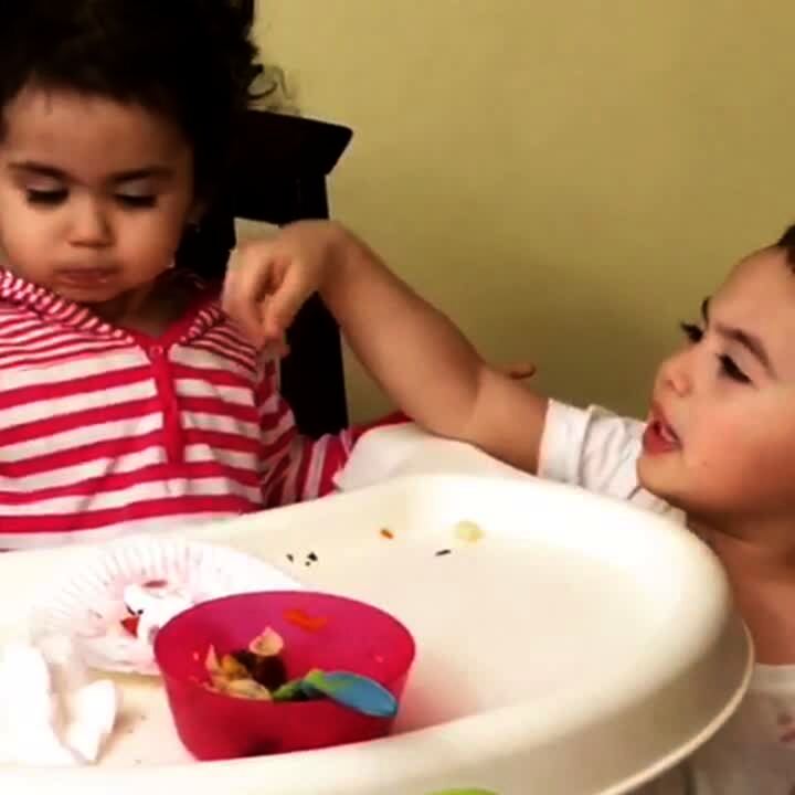 A tot girl eats strawberries in her high chair, and her brother opens his mouth to ask for a bite and the girl holds a strawberry near him then pulls her hand back and eats it herself.