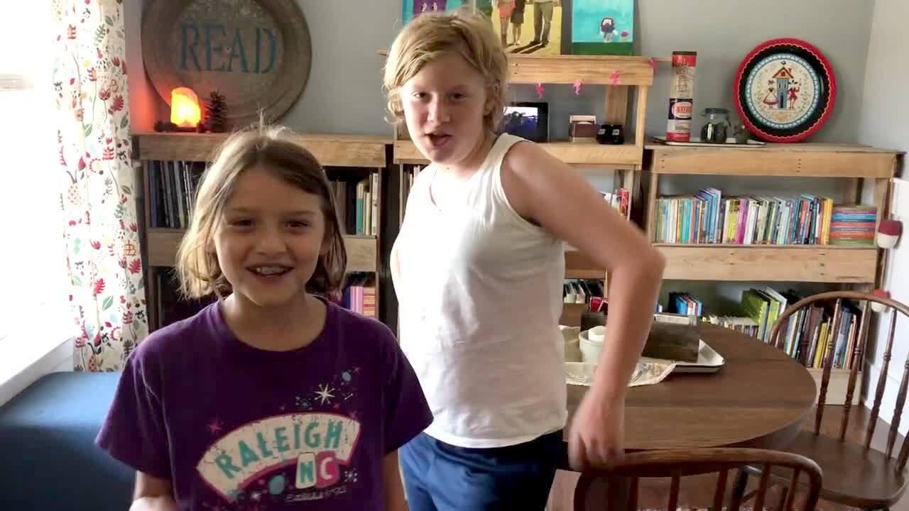 A woman asks both her young son and daughter whether they ate a package of crackers. When she turns to the family dog it looks guilty and hides behind the little girl next to the couch.