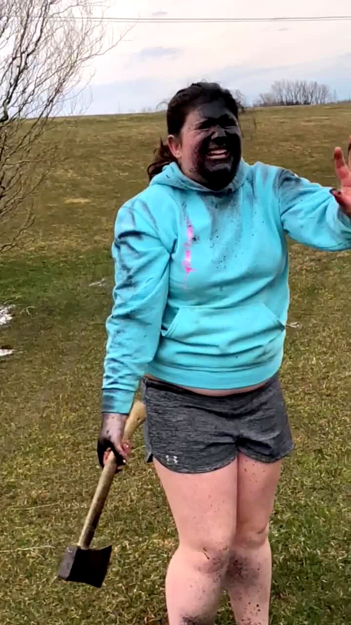 A teen girl hits a can of spray paint with an axe in slow motion and the paint explodes all over her and covers her face. Featured talent cleared (the girl with the axe)