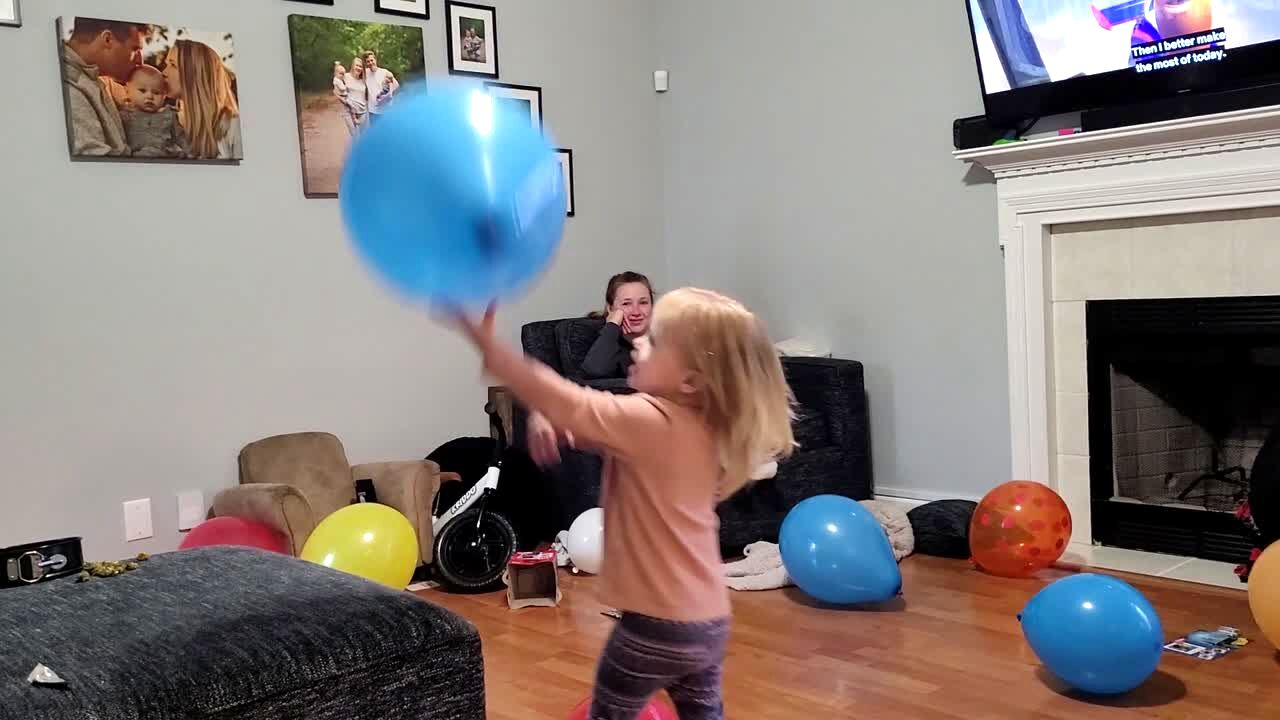 A young girl plays with a balloon and bounces it in the air above her. A woman off camera says she has "such good coordination" and as soon as she says it the girl bumps into a piece of furniture and falls to the ground.