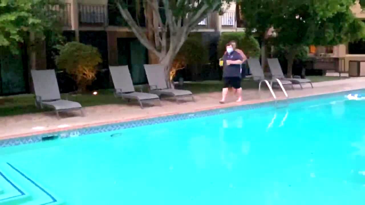 A man pushes his friend into a pool and he drops both of his drinks as he falls into the water. Slow motion. Featured talent cleared only (the two men going into the pool).