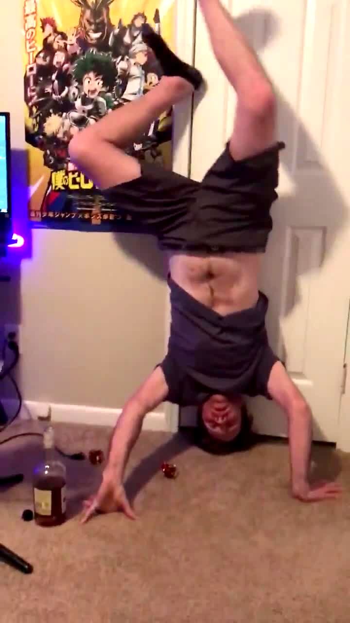 A man does a hand stand against a wall at home, but he gets the waistband of his shorts stuck on the doorknob.
