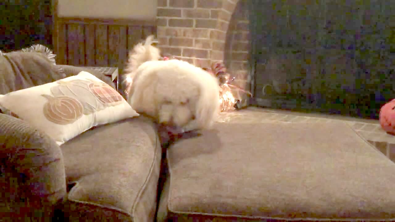 A poodle dog tries to retrieve a ball stuck in the crease of a couch in a living room. She repeatedly jumps up and gets her face stuck in the crease of the couch.