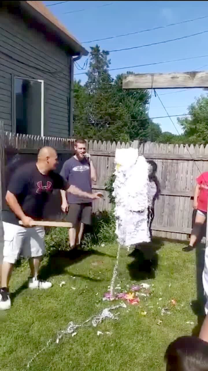 A man swings at a pinata in the backyard but misses and accidentally hits another man in the groin.