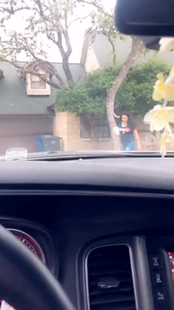A car runs over a young boy's birthday present in a street as a parade of cars drive past his house to celebrate in quarantine and his mom yells and laughs.