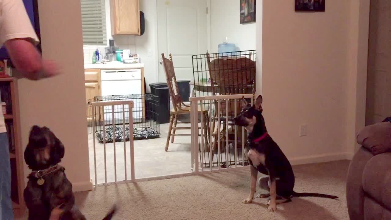 A young boy runs down a hallway and into a kitchen on a long line of bubble wrap, making a long popping noise. Very cute.