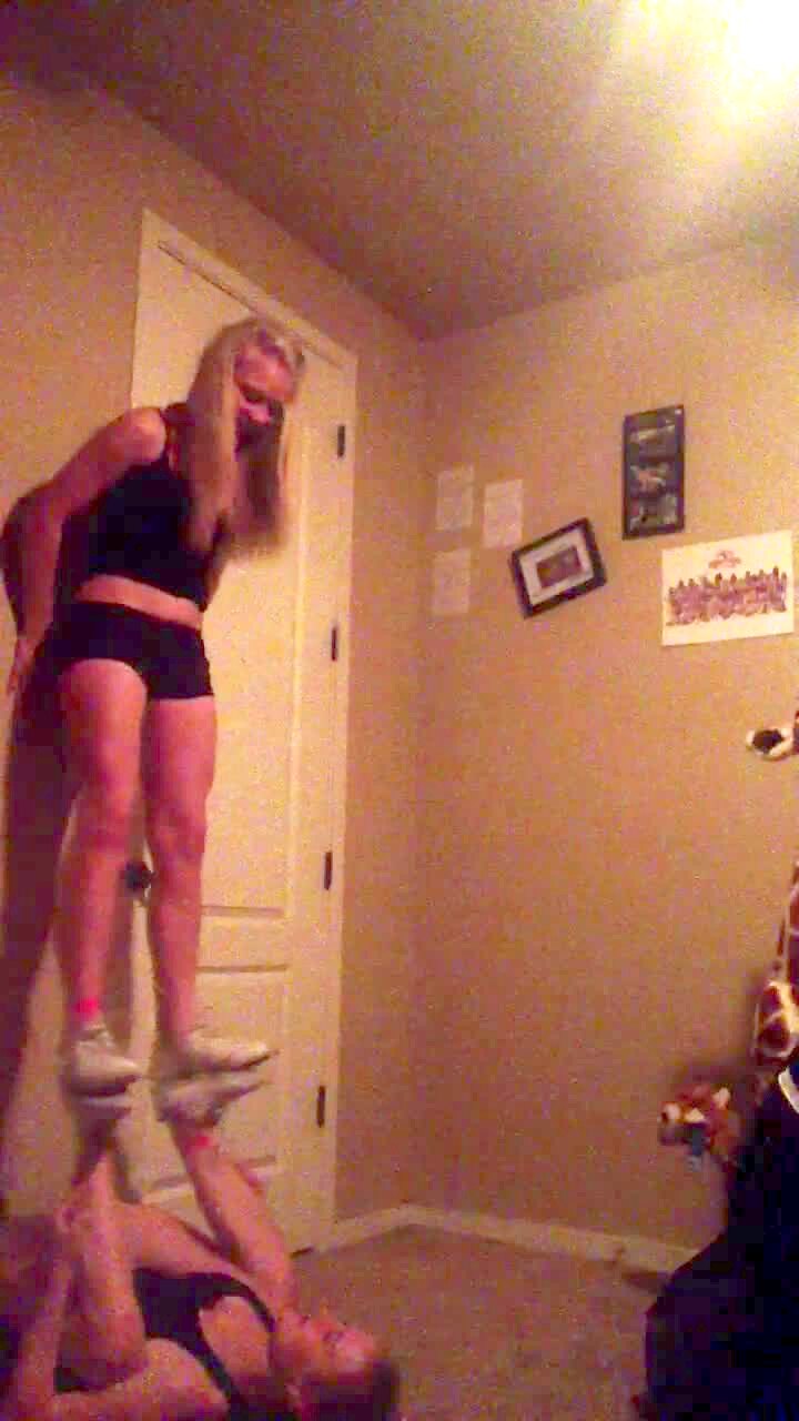 Teen girl lays on her back on the floor and tries to catch her friend. Other girl face plants into laying girl's stomach. She flips over.
