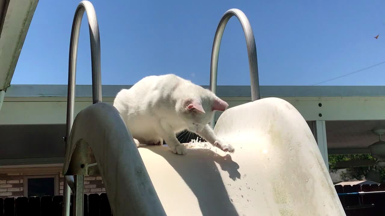 A senior man zip lines over a backyard pool, but the line breaks, and he falls in the water.