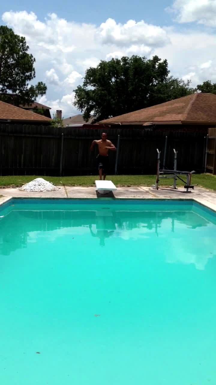 A man runs up on a diving board outdoors and when he runs off it, it breaks off and falls into the pool with him.