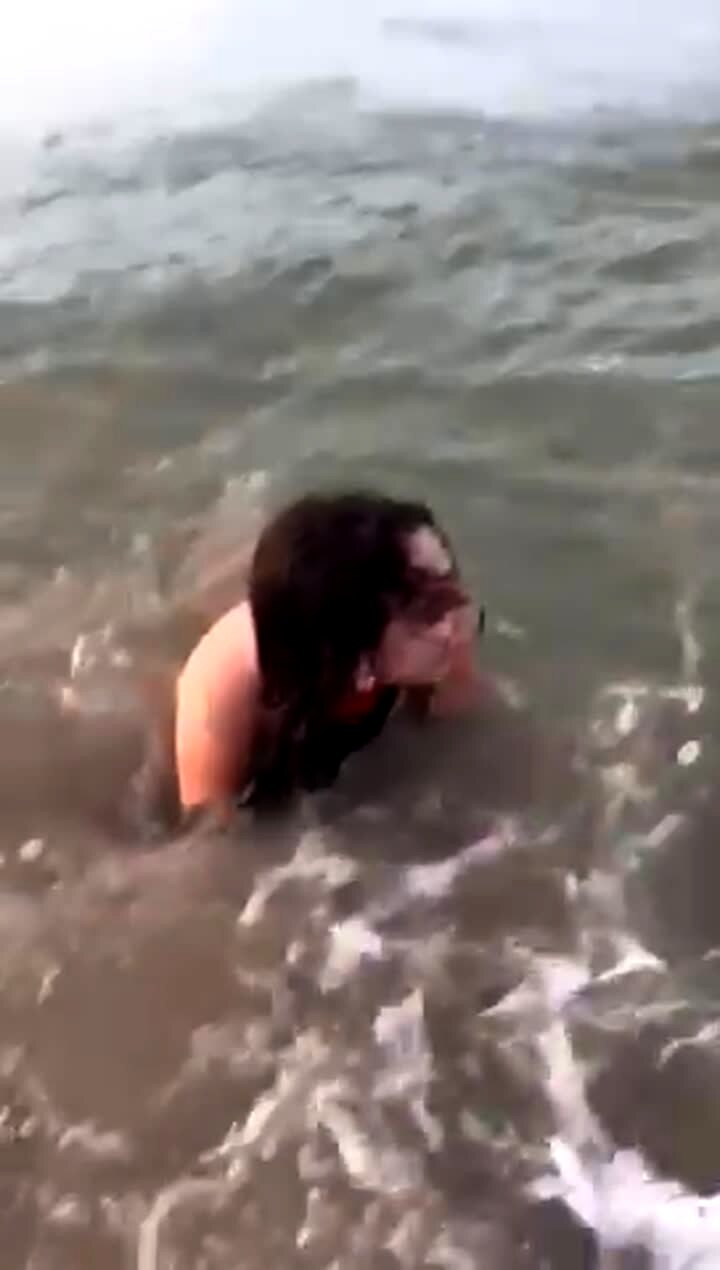 A woman stands in water at the beach, then a large wave crashes over her and knocks her down.