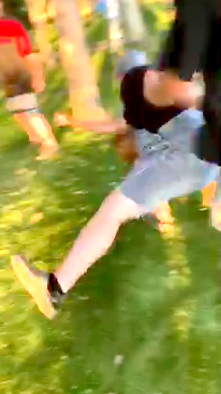 Two women pick a third woman up to try and throw her in a swimming pool at a gathering. Instead they drop her on the cement pool deck, and one of the instigators falls in the water. Feature talent cleared only (the two women carrying their friend and the friend).