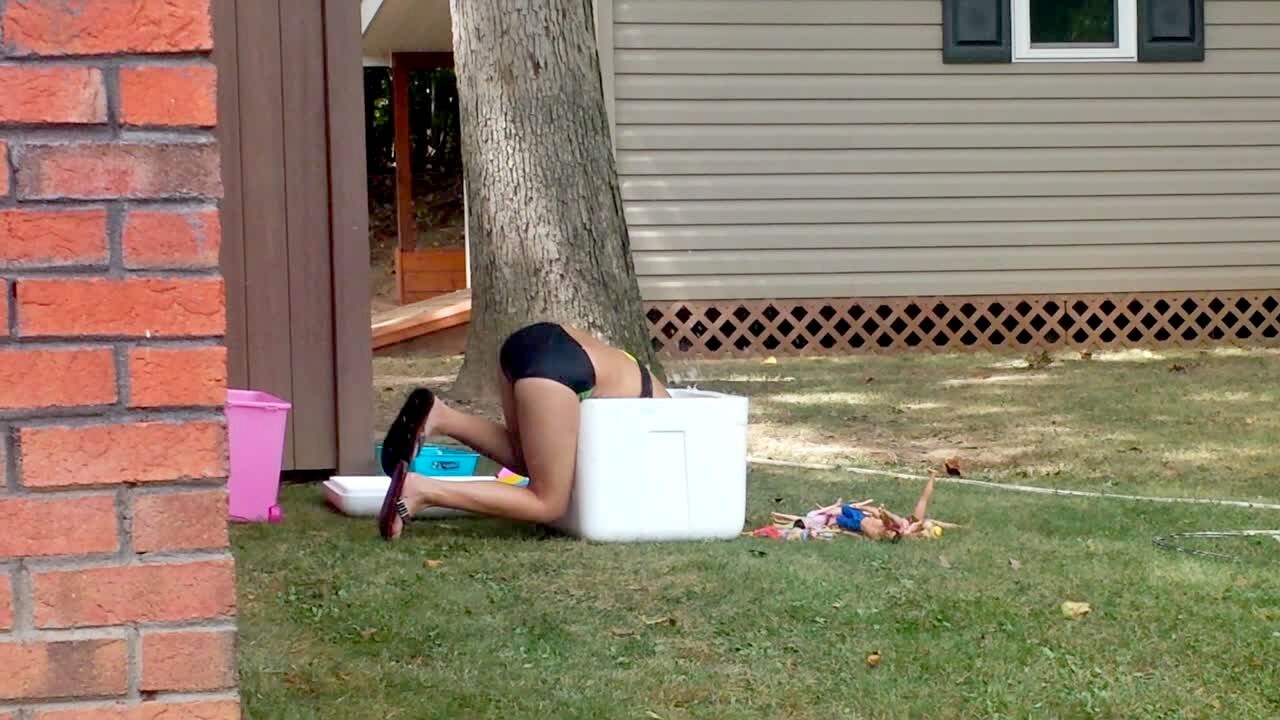 A girl leans over a cooler of ice water to get her hair wet before she slips and falls with her head in the water.
