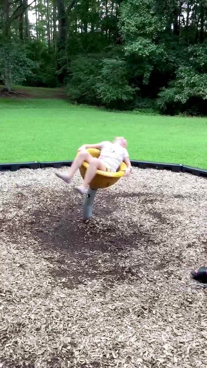 A man spins a young girl in a spinning chair at a playground park and she flies out of it.
