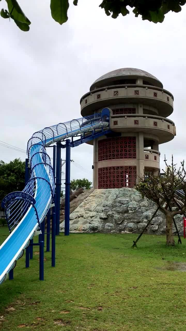 A girl rides down a steep slide at a park and falls into a puddle at the bottom.