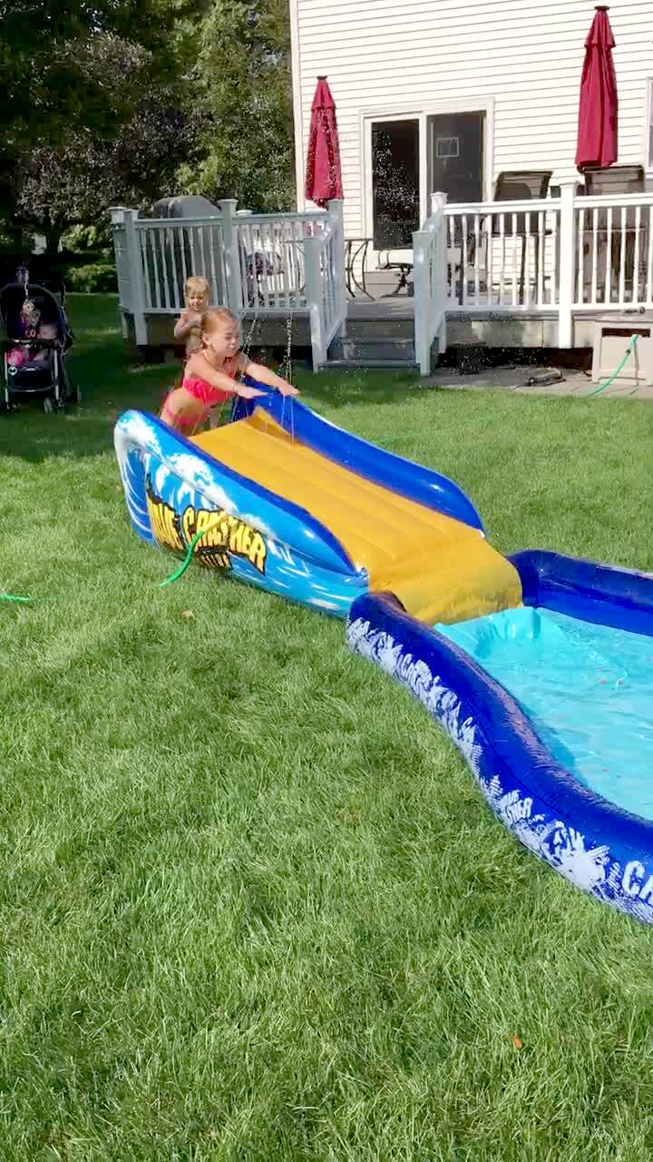 A woman runs and jumps onto a slip-n-slide in the yard while another woman stands at the end of it. She crashes into her and knocks her down.