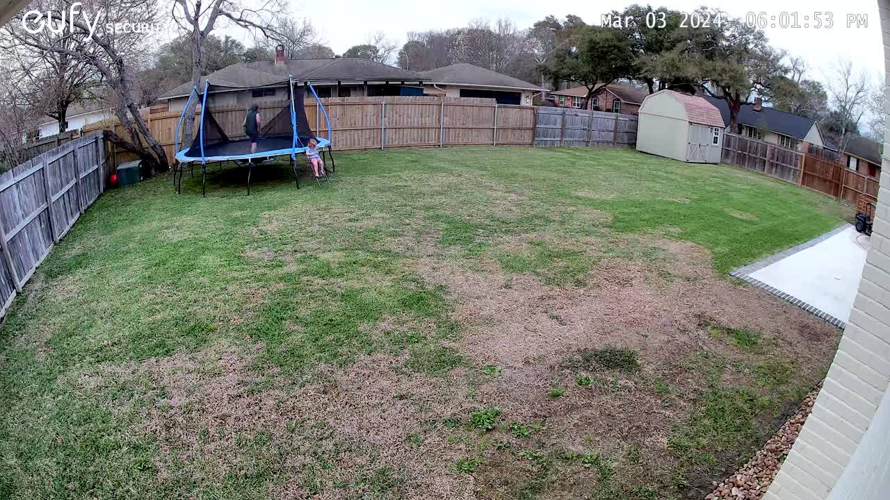 Two young boys and a young girl jump on a trampoline, when they fall into the net around it and fall down to the yard. Security footage.