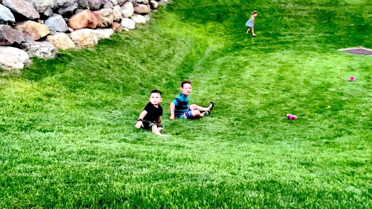 A young girl slips and falls over a small stream. She slides across the water and then falls on her rear.