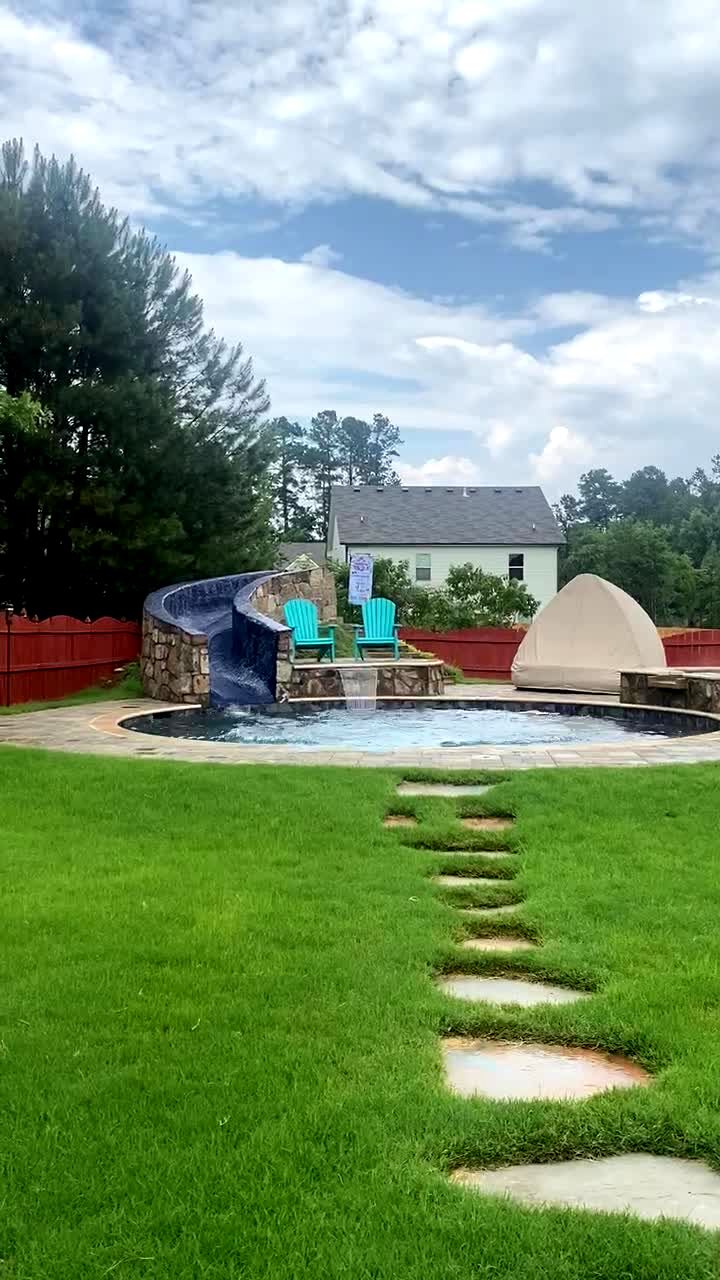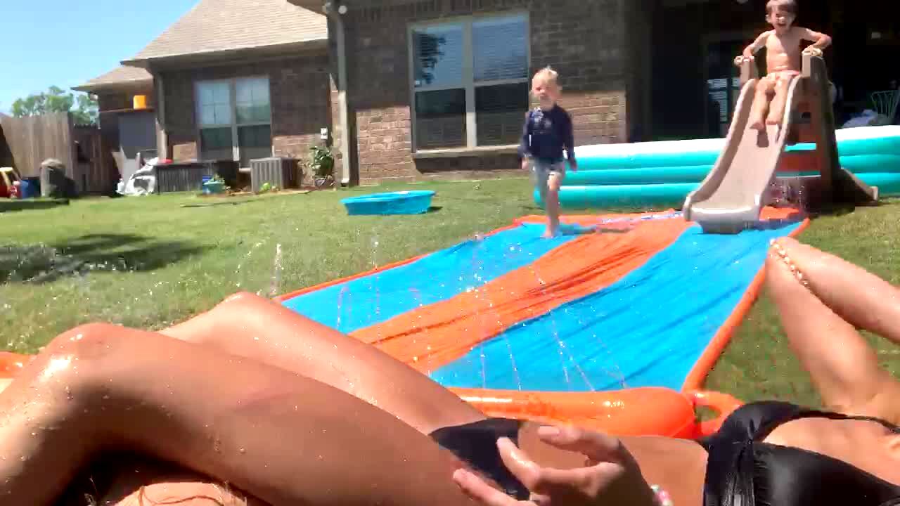 A woman climbs onto a small toy slide to slide into a swimming pool. The slide collapses beneath her and she falls to the ground.