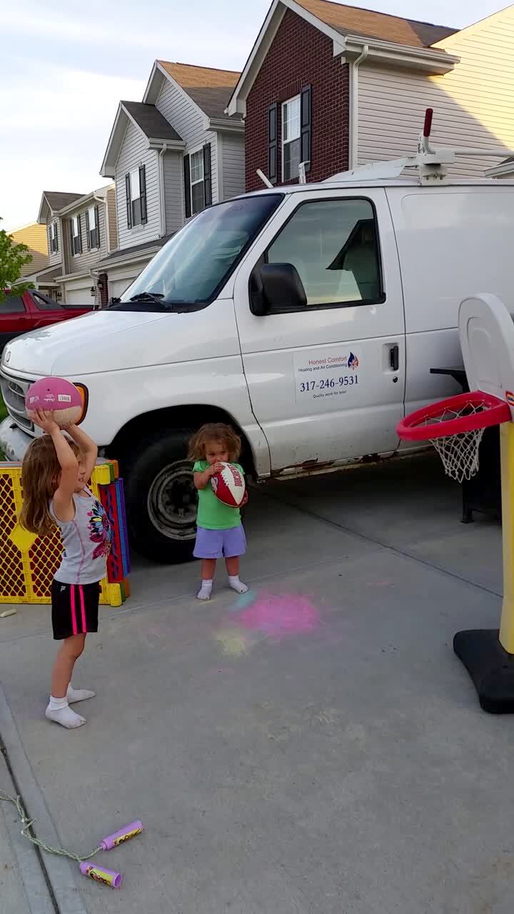 A teen girl in a driveway tries to shoot a basketball into a net but misses and shatters a light over a garage.