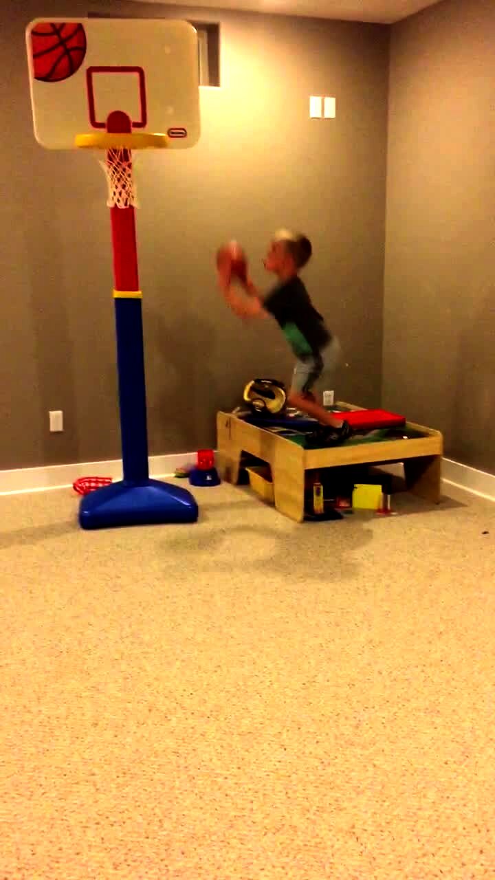 A tot boy runs and jumps off a table to make a slam drunk on a toy basketball hoop, but then the hoop falls on his head indoors.