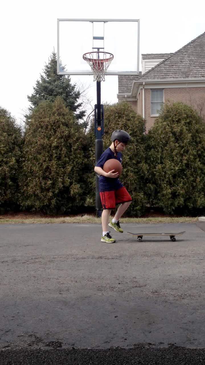 A boy uses a trampoline to elevate to dunk a basketball in a hoop. When he hangs on the rim the entire hoop comes crashing down, pinning him to the ground. Surveillance footage. Screen recording.