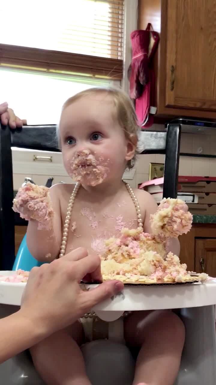 A tot girl in a high chair sticks her face in her birthday cake, takes a bite, then pulls the cake apart.