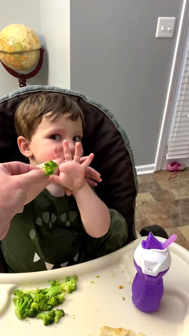 A young boy in a highchair tried to hand a pile of broccoli with his hands. His father tells him to eat his vegetables or no dessert. Then the boy eats the food.