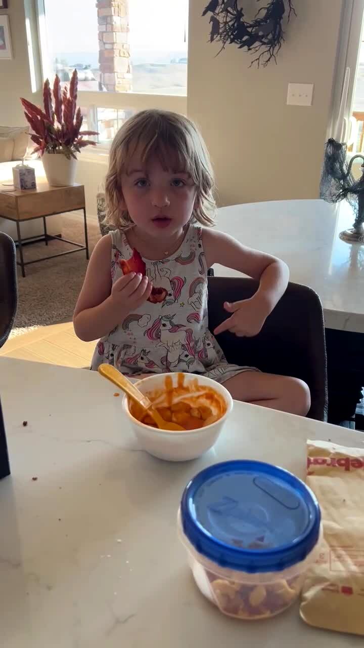 A tot girl eats bacon and tomato soup in the dining room. She explains to a woman behind the camera that she keeps the soup on one side of her stomach and solid foods on the other. She says she only has room for bacon at the moment.
