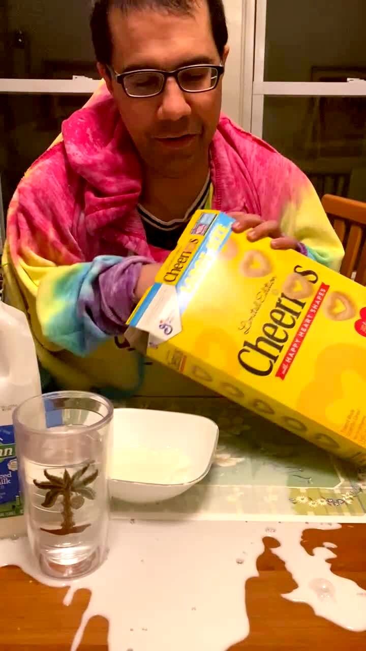 A man does the Borrowed Hands challenge with a young boy's arms. He tries to make a bowl of cereal but spills the milk all over the table, and then he eats a fried egg with his hands.