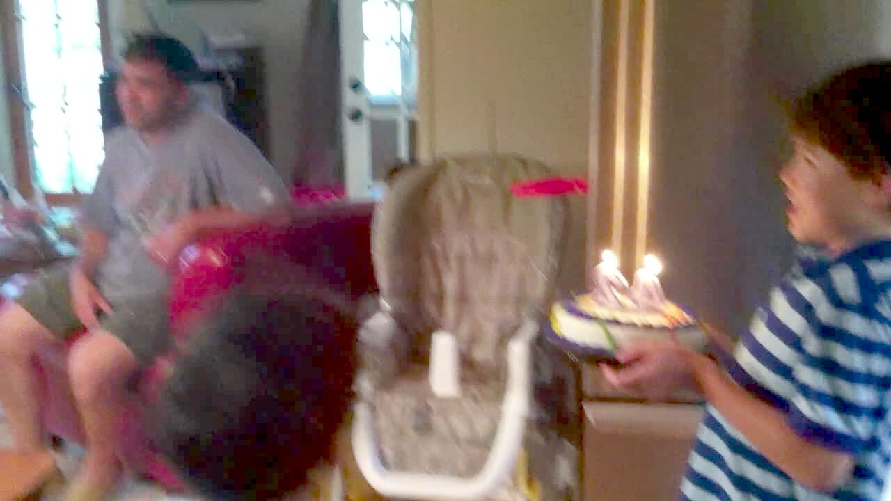 A young boy opens a soda in the yard and foam explodes all over his face as the can shoots out of his hand in slow motion.