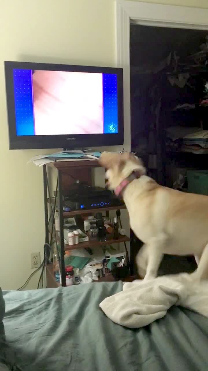A woman tries to bring a man breakfast in bed but it won't fit through the doorway. She tries to adjust it and the food falls on the carpet.