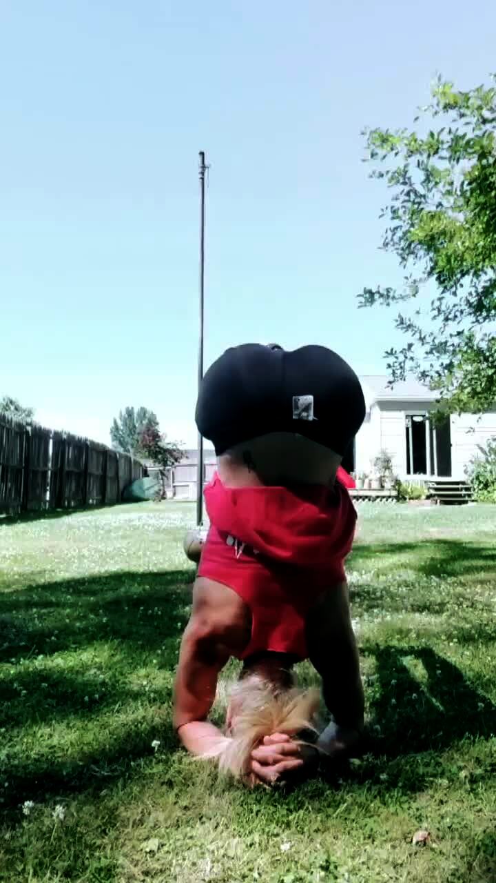 A woman does a headstand in a back yard and her tot son runs up and pushes her down.
