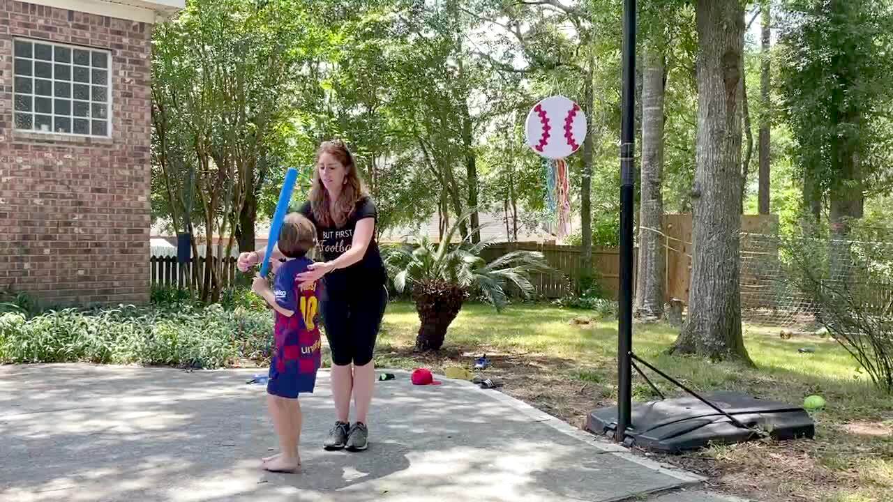 A woman spins a young boy to hit a pi�ata in the yard, and the boy hits her in the arm with the bat.