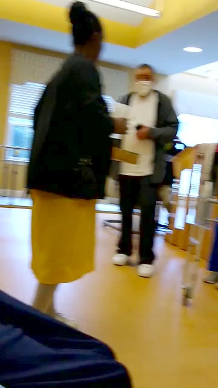 A woman walks out of a nursing home with a trick fishing line and rubber worm that follows behind her. She screams as it chases her out of the door.