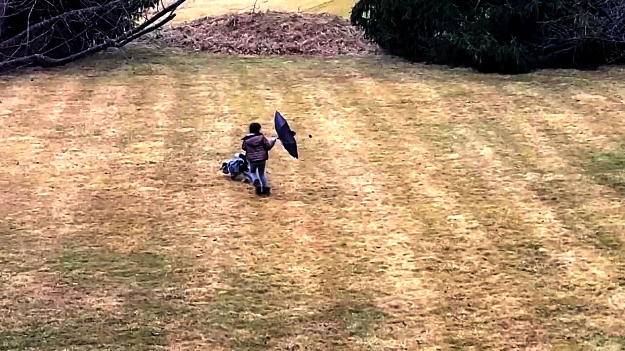A young girl tries to walk a dog and her umbrella blows inside out and she struggles to fix it in the backyard.