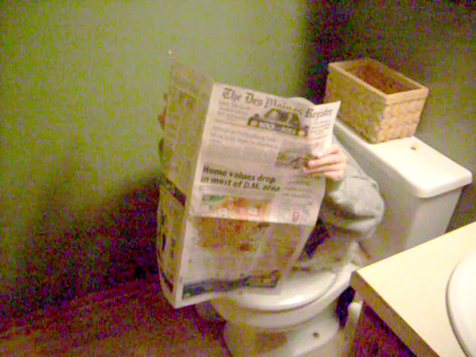 A boy holds a newspaper, crouched on a toilet with a dog in his sweatshirt, making it look like the dog is using the bathroom while reading. The woman behind the camera acts as though she's walked in on him.
