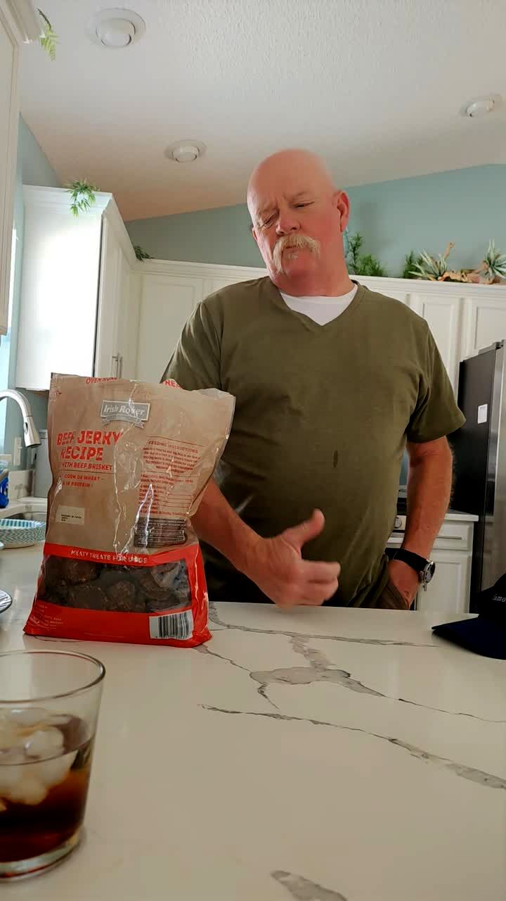 A senior man eats a snack in the kitchen. His adult son asks how the food is, and the man says "not very good." His wife then tells him that he just ate a dog treat by mistake.