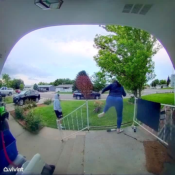 A teen girl stands on her back porch when a golden retriever pushes her from behind with its paws. As the dog runs away the girl maneuvers herself in the air so that she doesn't fall on a a metal pole. Security Footage.