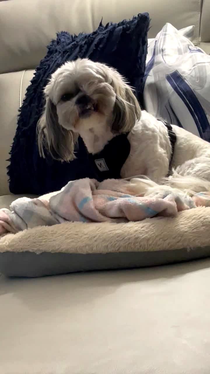 A man asks his Shih Tzu dog if she is ready to go take a bath, and she curls her lip at him in a living room.