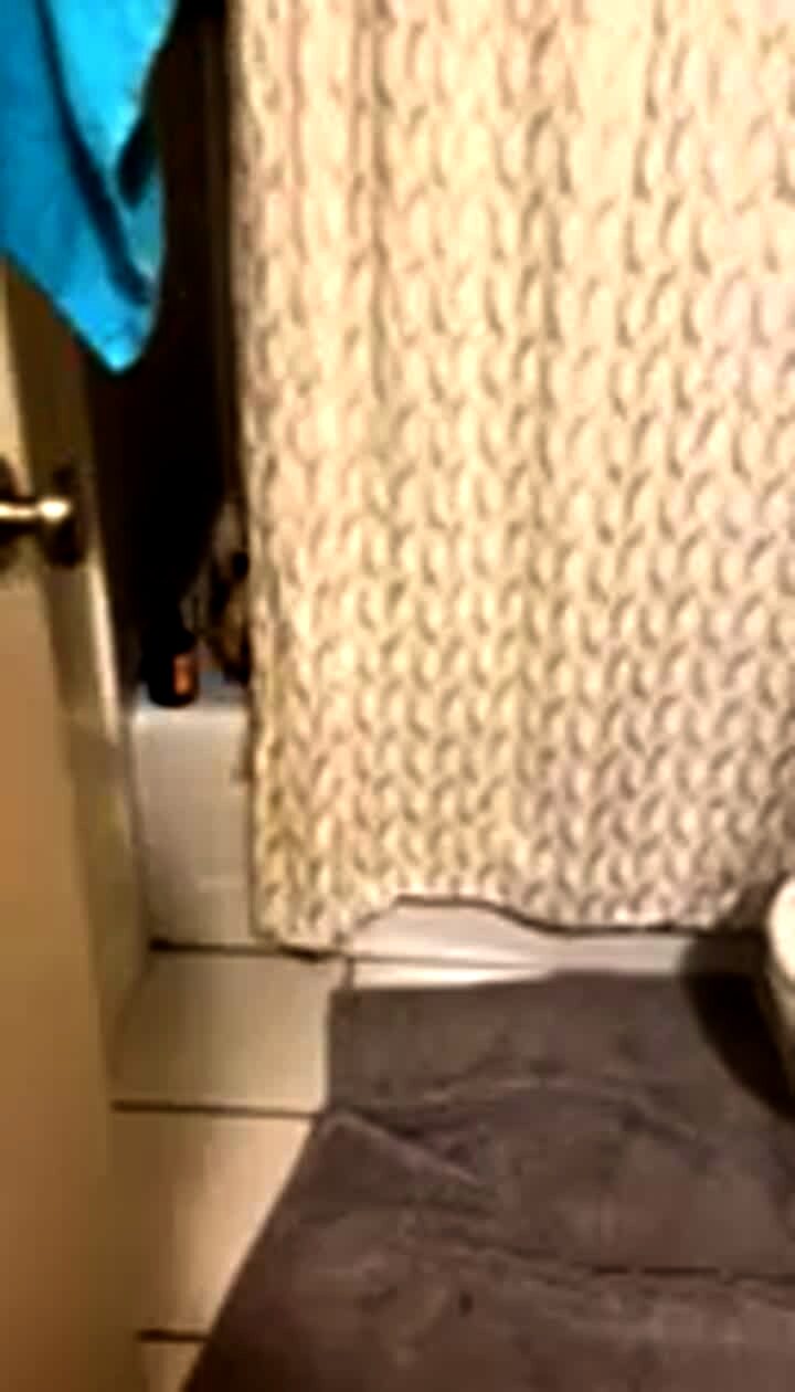 Shreds of junk are littered across a floor. A Golden Doodle hides in a shower. A woman pulls the curtain back and says to the dog, "Ogden, what did you do? Did you get in the trash?"