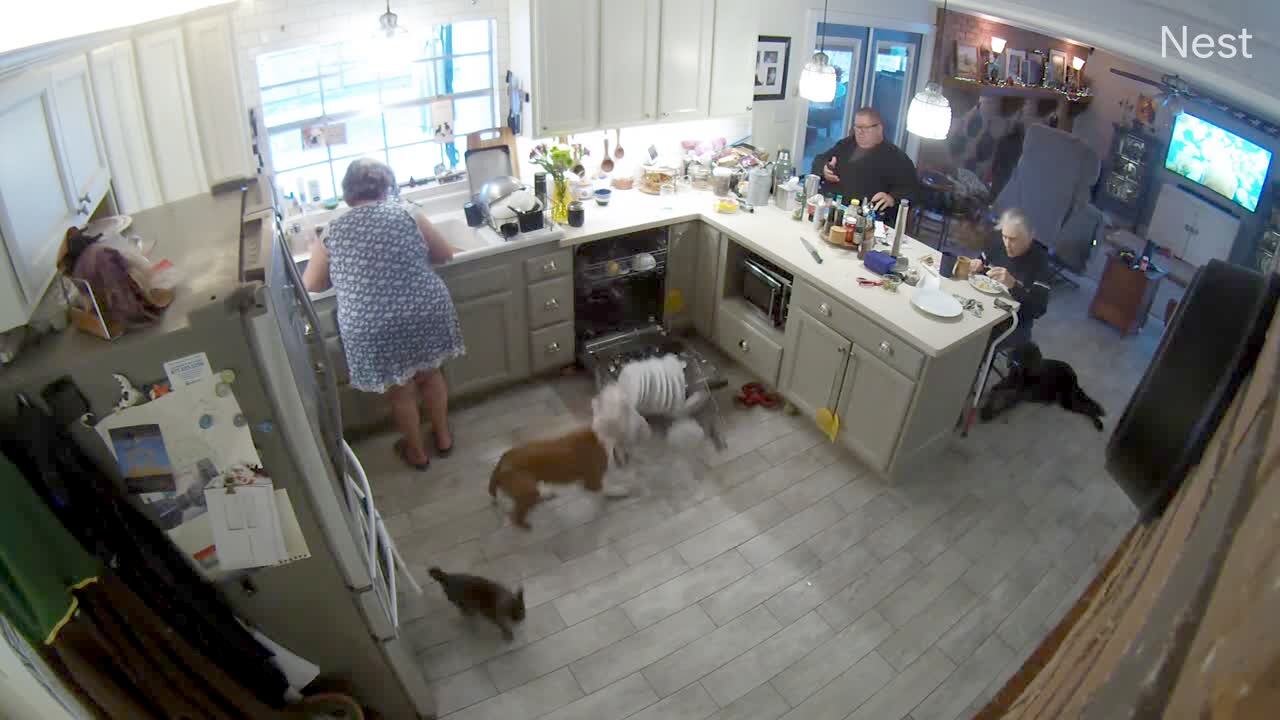A pit bull dog gets stuck on the bottom rack of the dishwasher, then drags the rack across the kitchen floor. Security footage.