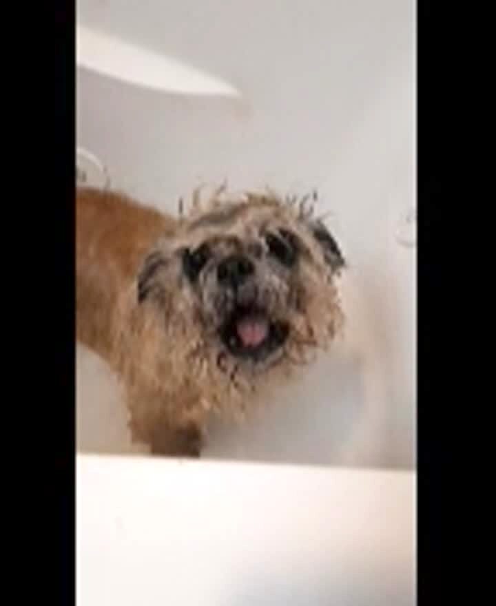 A wet terrier mix dog opens his mouth wide and makes a roaring sound while he stands in a bathtub.